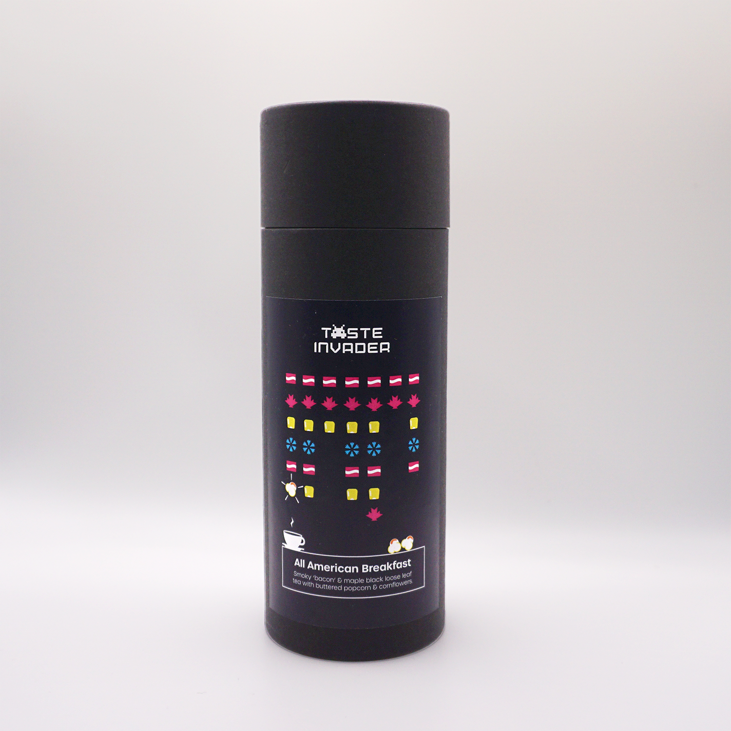 Ingredients: 60g whole loose leaf black tea blended with homemade crispy fake bacon pieces, maple flavouring, popcorn & cornflowers.